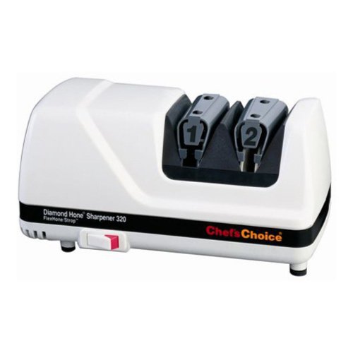 The Chef'sChoice 320 Diamond Hone FlexHone/Strop Professional Knife Sharpener lets you take pride in your status as a tool-wielding mammal by keeping your implements in better shape than those of our caveman ancestors. This professional electric knife sharpener hones the blades of gourmet, butcher, hunting, and even serrated knives in a simple two step process. Conical 100% diamond-coated disks in Stages 1 and a stropping/polishing disk in Stage 2 together create an edge of unprecedented sharpness and durability. High precision elastomeric angle guides eliminate all guesswork, while a magnetic
